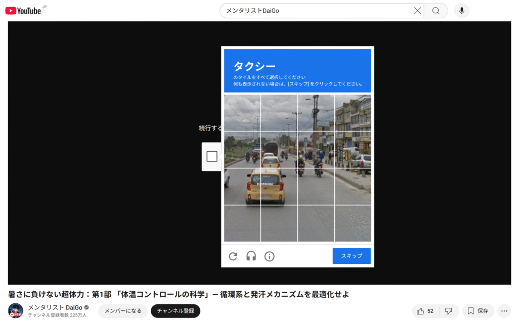 音楽以外のコンテンツ、たとえばメンタリストDaiGoさんの動画を見ようとすると、同じように画像認証が表示される。